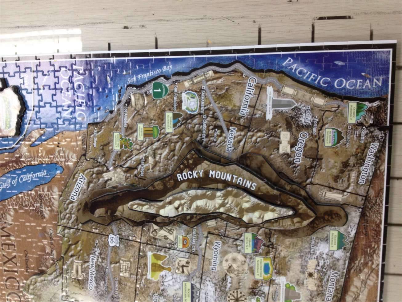 The buildings fit into pre-cut holes in a traditional 2D jigsaw puzzle that form the country’s layout and Rocky Mountains.